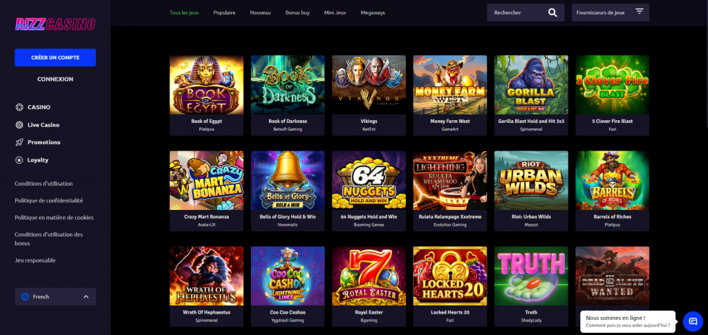 | Rizz | 50 FS sans dépôt + 100 % | 35x | 20 min | Curacao | 2800+ | 81 | 18-30 ans |